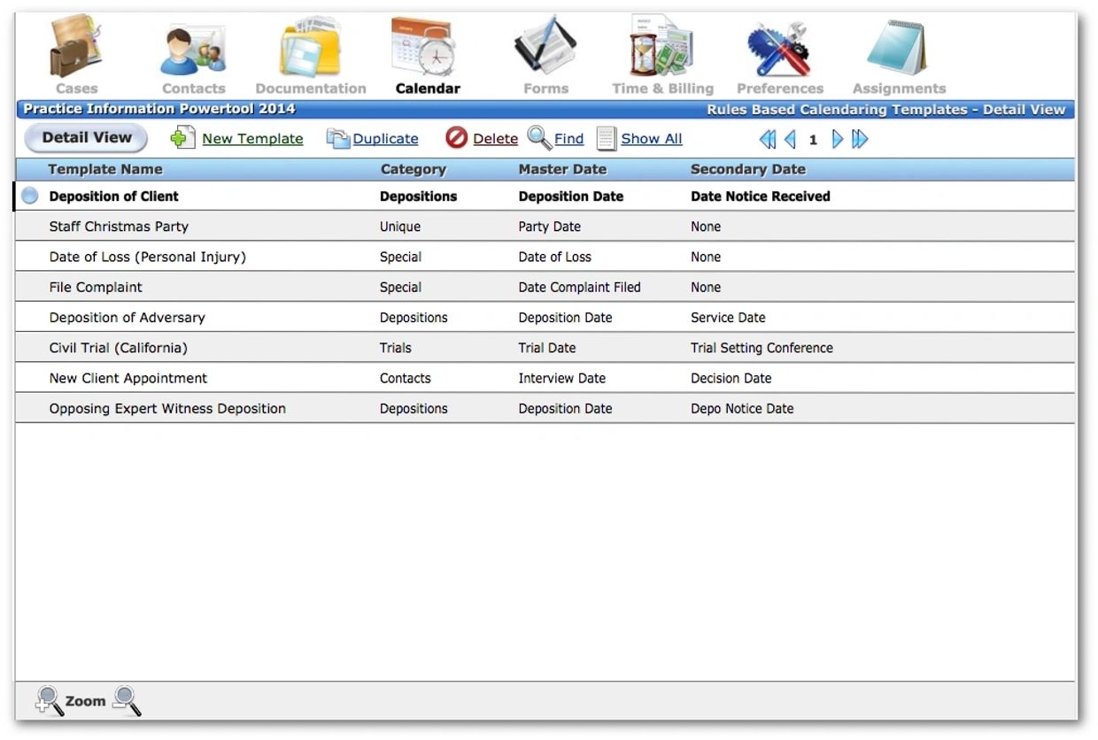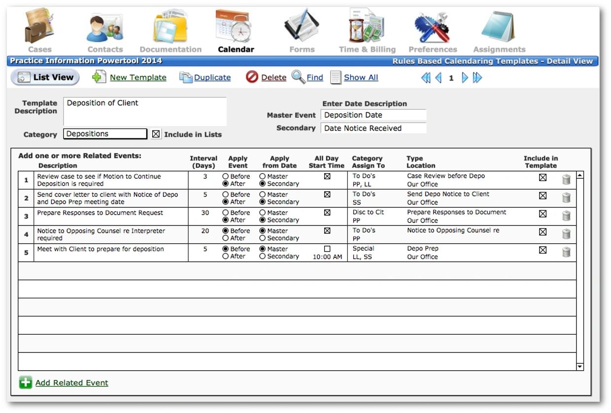 The Rules Based Calendaring Module automates data entry of Calendar Events through the use of Templates. Templates contain a Master Event and a series of Related Events that are calculated based on the number of days before or after the Master Event. The Related Events are calendared automatically when the Master Event is added to the Calendar. Templates can be created for both Litigation and Non-litigation events.